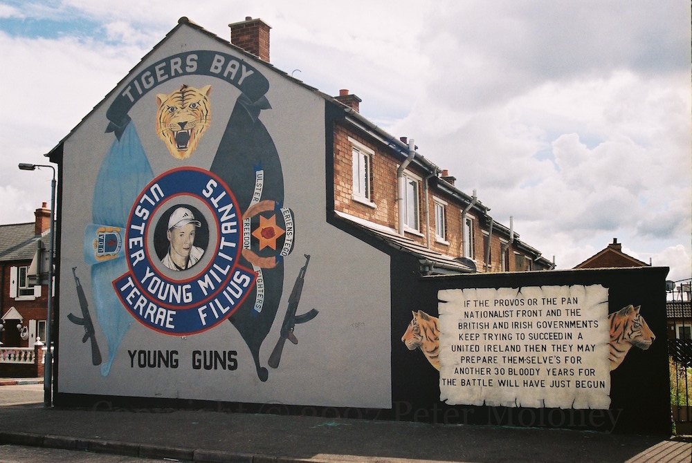 Sixteen year-old Glen “Spacer” Branagh was killed by a premature blast bomb during a riot on Remembrance Sunday (Nov. 11), 2001. His portrait is on a board at the centre of UDA flags and guns (and the tiger of Tiger’s Bay). “Ulster Young Militants – Terrae filius.” The background was previously yellow.
