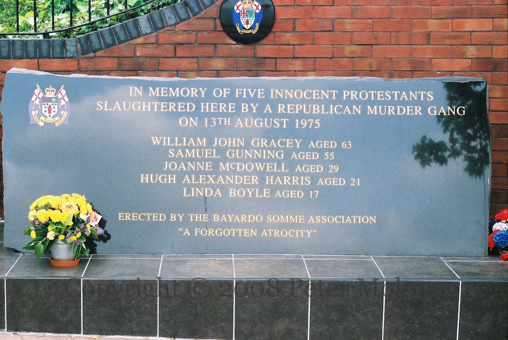 “In memory of five innocent Protestants slaughtered here by a republican murder gang on 13th August 1975. William John Gracey Aged 63, Samuel Gunning, aged 55, Joanne McDowell aged 29, Hugh Alexander Harris aged 21, Linda Boyle aged 17. Erected by the Bayardo Somme Association. “A forgotten atrocity””