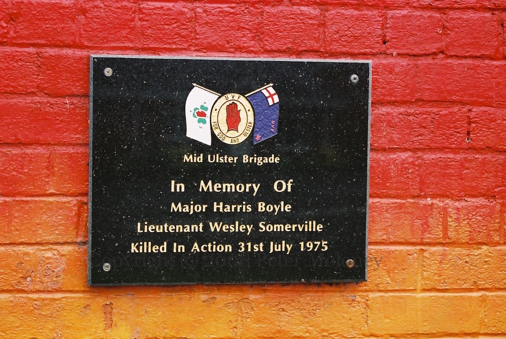 Harris Boyle and Wesley Somerville were UDR soldiers and UVF volunteers. They were “killed in action” when the bomb they were planting on the minibus of the Miami Showband went off prematurely. Of the pair, only Somerville’s arm with its “UVF Portadown” tattoo remained identifiable (WP). The plaque is in Princess Way/Gloucester Avenue, Portadown.