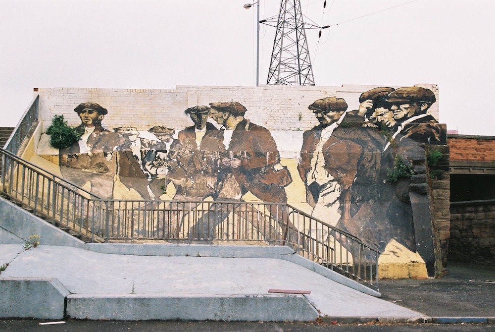The Harland & Wolff shipyard is on Queen’s Island, a piece of land formed when the channel into Belfast was expanded. Workers would walk from east Belfast to the shipyard. This is the scene in (modern-day) Armitage Close/Harkness Parade in east Belfast, with a mural of turn-of-the-century shipyard workers by John Johnston, drawing inspiration from William Conor’s Shipyard Workers Crossing Queen’s Bridge and Over The Bridge.