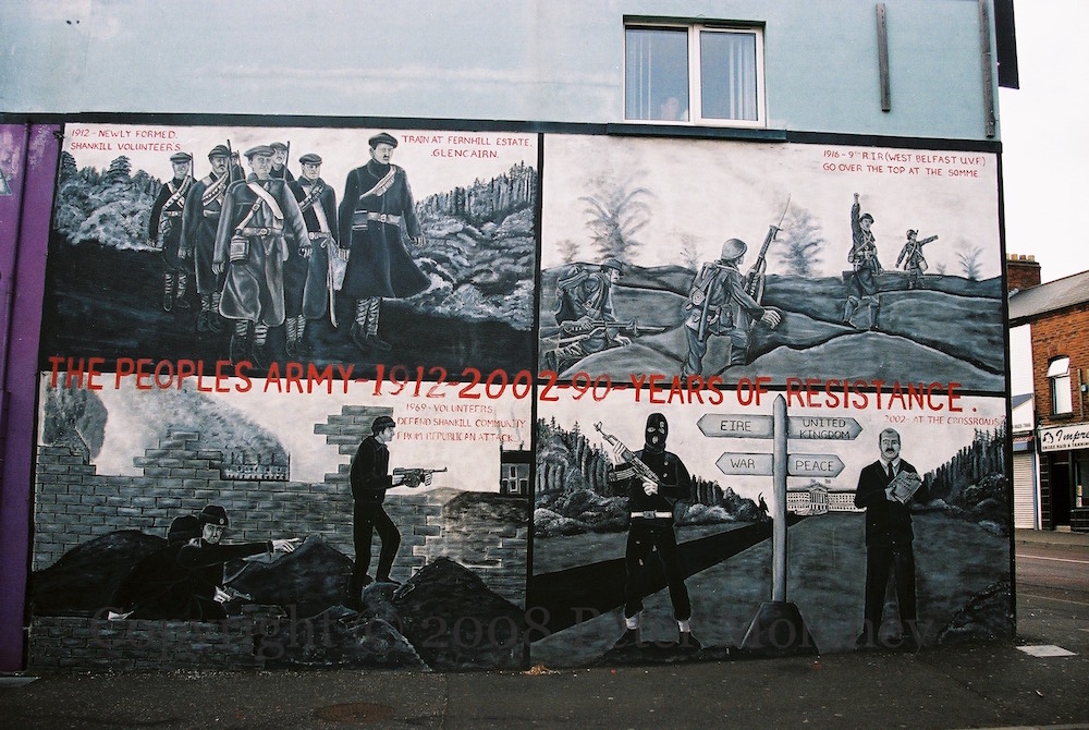 “The People’s Army 1912-2002 – 90 years of resistance.” The top two panels show the “newly-formed Shankill Volunteers” “train[ing] at Fernhill estate, Glencairn” and then in 1916 the “9th RIR (West Belfast UVF) go over the top at the Somme.” Below, “volunteers defend the Shankill community from republican attack” in the 1969 riots in Bombay Street and environs, leading to the “crossroads” of 2002, with David Ervine holding a copy of the “Good Friday Agreement” on the road to “peace”.