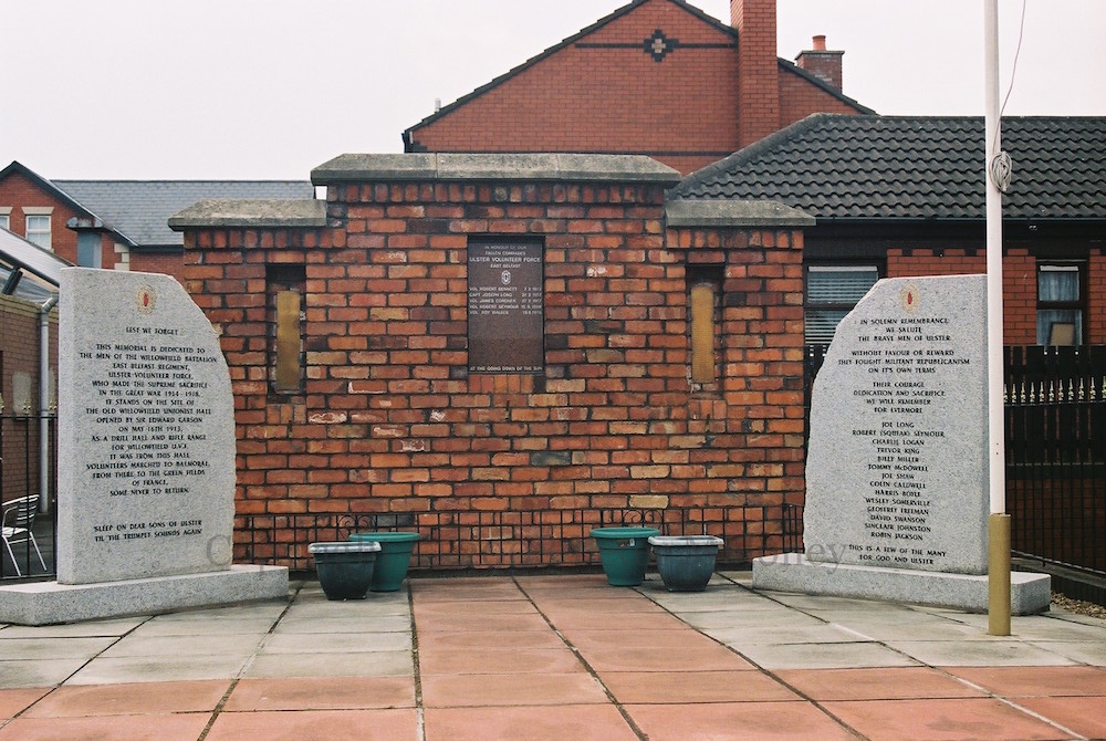 “Lest we forget. This memorial is dedicated to the men of the Willowfield Battalion, East Belfast regiment, Ulster Volunteer Force, who made the supreme sacrifice in the Great War 1914-1918. It stands on the site of the old Willowfield unionist hall, opened by Sir Edward Carson on May 16th 1913, as a drill hall and rifle range for Willowfield UVF. It was from this hall volunteers marched to Balmoral, from there to the green fields of France, some never to return. Sleep on, dear sons of Ulster, ’til the trumpet sounds again.”