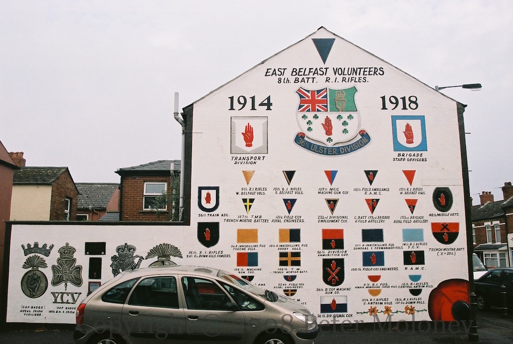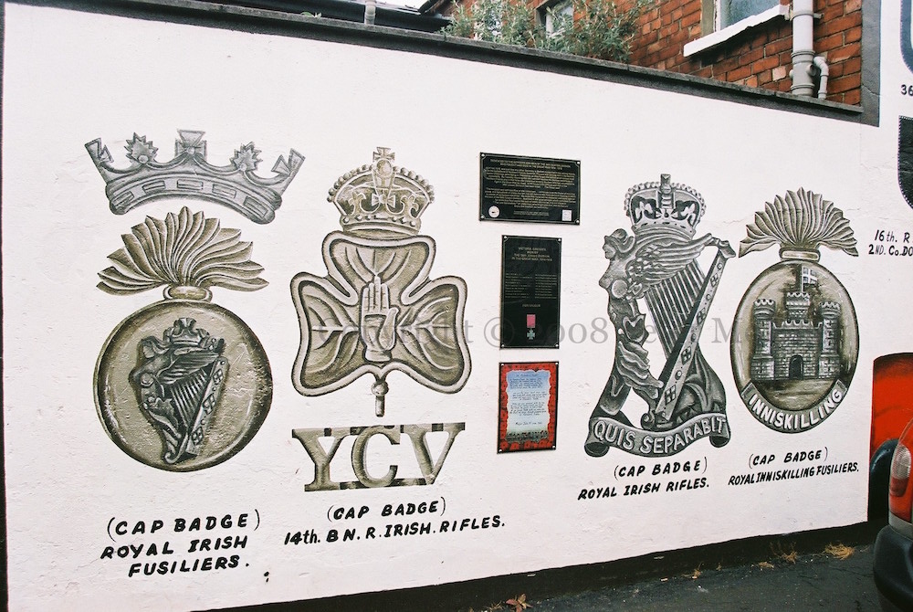 This mural and its accompanying plaques, at the mouth of Canada Street, commemorate WWI and celebrate the nine Victoria Crosses won by members of the 36th (Ulster) Division “For valour”: Cather, McFadzean, Bell, Quigg, Emerson, De Wind, Seaman, Knox, and Harvey; the final plaque is McCrae’s In Flanders’ Fields. The main mural features insignia of more than thirty units of types ranging from machine gunners to vets.