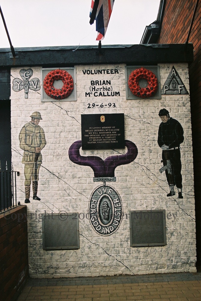 “In loving memory of Brian (Herbie) McCallum. We will remember him. The officers and members of Sweeneys ‘A’ company, 1st Belfast battalion, Ulster Volunteer Force.” Brian “Herbie” McCallum was a 29 year-old attending a contentious loyalist parade to Whiterock Orange Hall, being re-routed by the RUC, when the grenade he was carrying exploded prematurely, killing him instantly. The mural and memorial shown above is at the top of Ainsworth Avenue, close to the spot of the incident. He died in hospital three days later (CAIN | Border & Border Politics | Irish News article at Nuzhound | Independent).