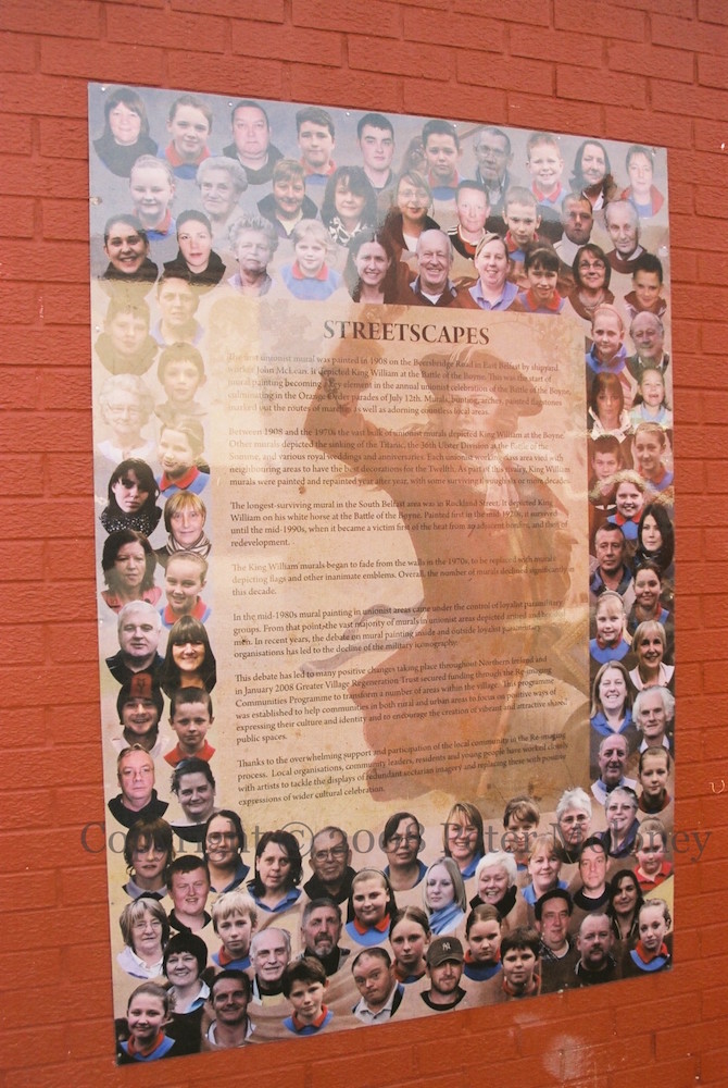 “The first unionist mural was painted in 1908 on the Beersbridge Road in East Belfast by shipyard worker John McLean. It depicted King William at the Battle of the Boyne. This was the start of mural painting becoming a key element in the annual unionist celebration of the Battle of the Boyne, culminating in the Orange Order parades of July 12th. Murals, bunting, arches, painted flagstones, marked out the route of marches as well as adorning countless local areas. Between 1908 and the 1970s the vast bulk of unionist murals depicted King William at the Boyne. Other murals depicted the sinking of the Titanic, the 36th Ulster [sic] Division at the Battle of the Somme, and various royal weddings and anniversaries. Each unionist working class area vied with the neighbouring areas to have the best decorations for the Twelfth. As part of this rivalry, King William murals were painted and repainted year after year, with some surviving through six or more decades. The longest-surviving mural in the South Belfast area was in Rockland Street. It depicted King William on his white horse at the Battle of the Boyne. Painted first in the mid-1920s, it survived until the mid-1990s, when it became a victim first of the heat from an adjacent bonfire, and then of redevelopment. The King William murals began to fade from the walls in the 1970s, to be replaced with murals depicting flags and other inanimate emblems. Overall, the number of murals declined significantly in this decade. In the mid-1980s mural painting in unionist areas came under the control of loyalist paramilitary groups. From that point, the vast majority of murals in unionist areas depicted armed and hooded men. In recent years, the debate on mural painting inside and outside loyalist paramilitary organisations has led to the decline of the military iconography. This debate has led to many positive changes taking place throughout Northern Ireland and in January 2008 Greater Village Regeneration Trust secured funding through the Re-imaging Communities Programme to transform a number of areas within the village. This programme was established to help communities in both rural and urban areas to focus on positive ways of expressing their culture and identity and to encourage the creation of vibrant and attractive shared spaces. Thanks to the overwhelming support and participation of the local community in the Re-imaging process. Local organisations, community leaders, residents and young people have worked closely with artists to tackle the displays of redundant sectarian imagery and replacing these with positive expressions of wider cultural celebration.