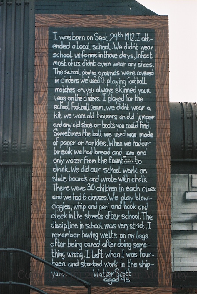 “… The school playing grounds were covered in cinders we used it playing football matches on, you always skinned your legs on the cinders. I played for the school football team, we didn’t wear a kit we wore old trousers an old jumper and any old shoe or boots you could find. Sometimes the ball we used was made of paper or hankies. … – Water Scott aged 95”