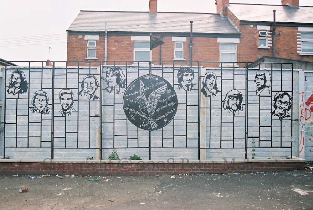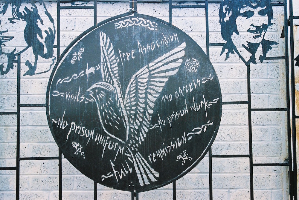 At the centre of the hunger strikers iron-work on the site of the (former) Andersonstown RUC barracks is a lark in barbed wire; the barbed wire, however, contains the five demands: no prison uniform, no prison work, free association, visits and parcels, and full remission.