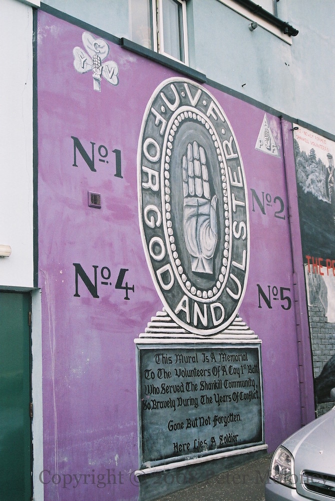 “This mural is a memorial to the volunteers of A Coy 1st Batt [platoon No 1, 2, 4, and 5] who served the Shankill community so bravely during the years of conflict. Gone but not forgotten. Here lies a soldier.”