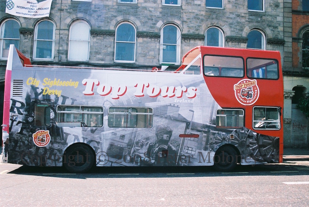 ‘Dark tourism’ comes to Derry: Free Derry Corner and The Petrol Bomber mural feature on the side of a CitySightSeeingDerry open-topped tourist bus.