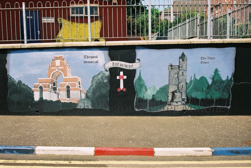 Images depicting a pair of WWI memorials – Thiepval Tower and Ulster Tower – are added to the Somme mural below the Cathedral Youth Club.