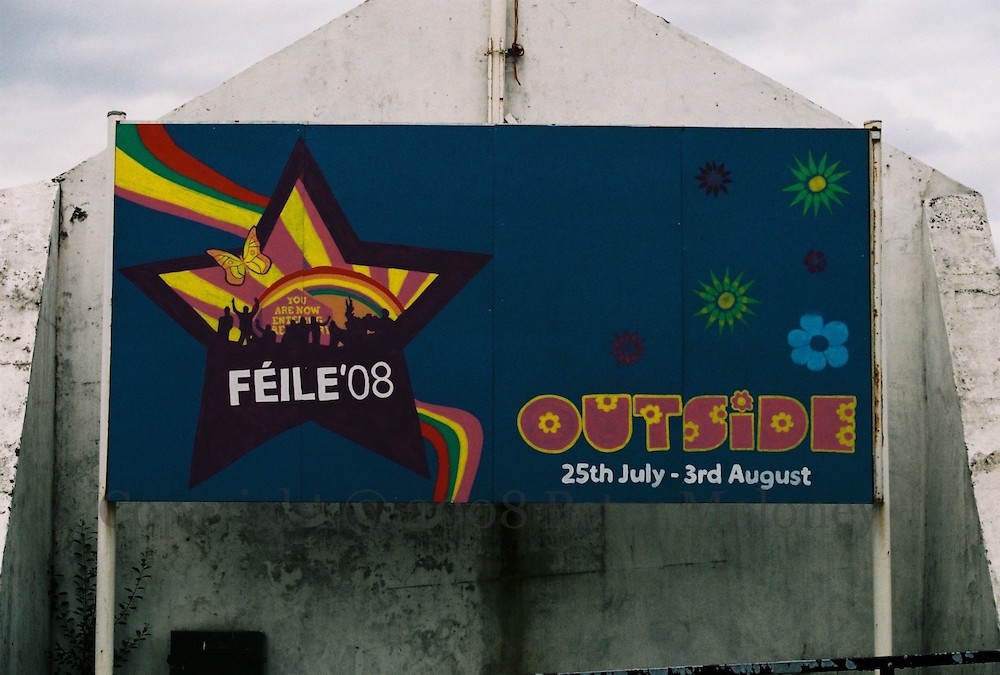 The back of Free Derry Corner is used to advertise the 2008 Gasyard Féıle, on the theme of ‘outside’. Free Derry Corner itself is depicted under the rainbow.