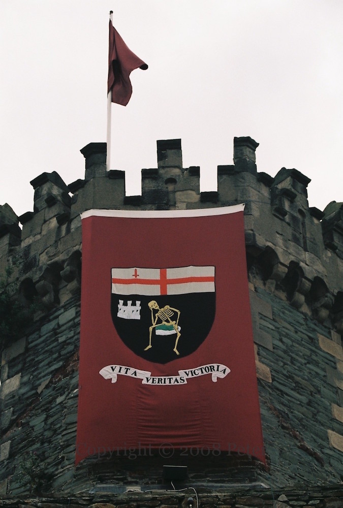“Life, Truth, Victory.” Londonderry city’s coat of arms is displayed on (what is now) Heritage Tower Museum (previously Derry Gaol), including a skeleton (WP). In the top part is the flag of the city of London.