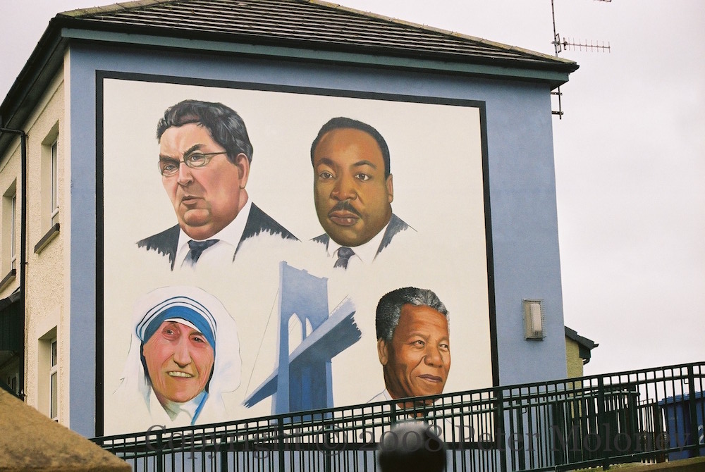 “A Tribute to John Hume” by the Bogside Artists. Hume is in the company of other Nobel peace prize-winners: Martin Luther King, Jr (1964), Nelson Mandela (1993), (the Derry bridge,) and Mother Teresa (1979). Hume was awarded the prize jointly with David Trimble in 1988, and Mandela with F. W. de Clerk.