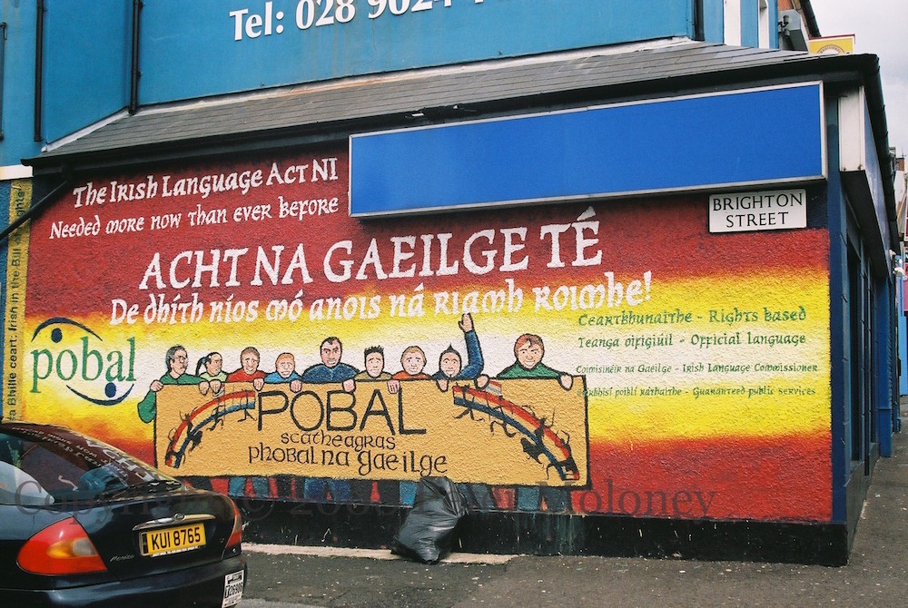 Campaigning for an Irish Language Act, begun with the Belfast Agreement (see the 2002 mural in this location which calls for “language rights”) and reinforced by the St Andrew’s Agreement in 2006, continues. “The Irish Language Act NI – needed more now than ever before.” “Acht na Gaeılge T[uaıscaırt] É[ıreann] – de dhíth níos mó anoıs ná rıamh roımhe!” Pobal is a non-profit community development organisation and umbrella group for Irish-language efforts.