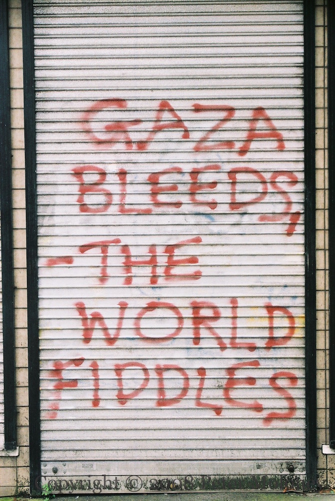 “Gaza bleeds, the world fiddles.” Graffiti on the Falls Road, Belfast, perhaps in response to the 112 Palestinians killed in February 2008 (WP | Al Jazeera). For a wide shot, see Hair Peace.