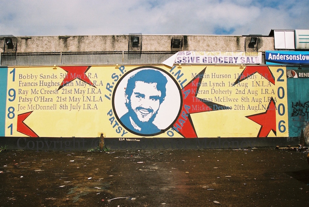 Patsy O’Hara of the INLA (the IRSP is its political wing) died on hunger strike on May 21st, 1981. This Shaws Road mural was painted for the 25th anniversary of his death. There is a signature of sorts at the bottom: “RSM [Republican Socialist Movement] Andersonstown”.