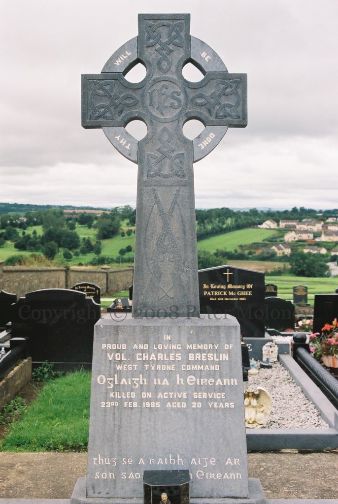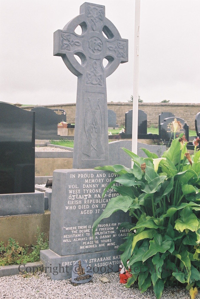 Gravestones to brothers Michael, David, and Hugh Devine, to Charles Breslin, who died alongside Michael and David, to “all those who gave their lives” – “Go luí cré ársa Thír Eoghaın go héadrom ar uıgheanna ár laochraı uaısle” [May the ancient Tyrone clay lie lightly on the graves of our noble warriors]; this headstone is featured in a Fountain Street mural – and Danny McCauley – “Where there is a struggle for justice, the desire for freedom and resistance to exploitation, there will always be a Danny McCauley.”