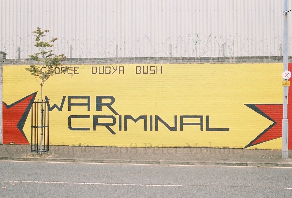 “George Dubya Bush – war criminal”. The WP page on Iraq war casualties cites a variety of sources putting the number of total deaths between 100,000 and 1.2 million. This Northumberland Street mural is from the IRSP.