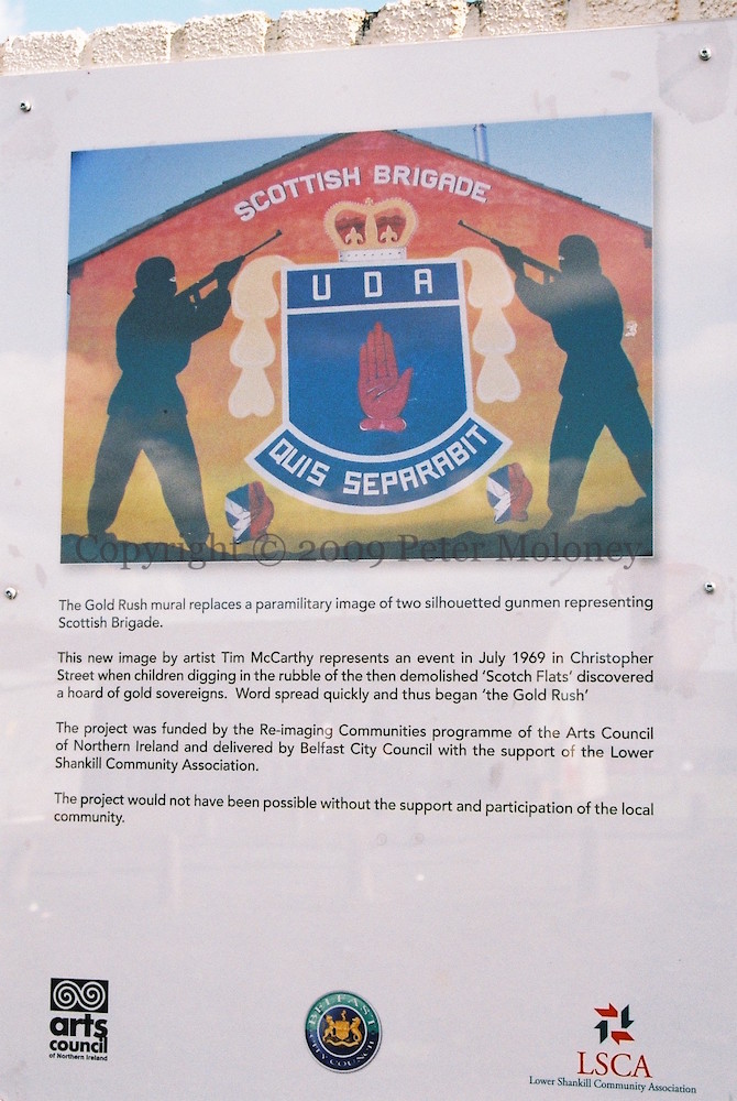 From the info board, later added to the left: “The Gold Rush mural replaces a paramilitary image of two silhouetted gunmen representing Scottish Brigade. This new image by artist Tim McCarthy represents an event in July 1969 in Christopher Street when children digging in the rubble of the then demolished ‘Scotch Flats’ discovered a hoard of gold sovereigns. Word spread quickly and thus began ‘the Gold Rush’.