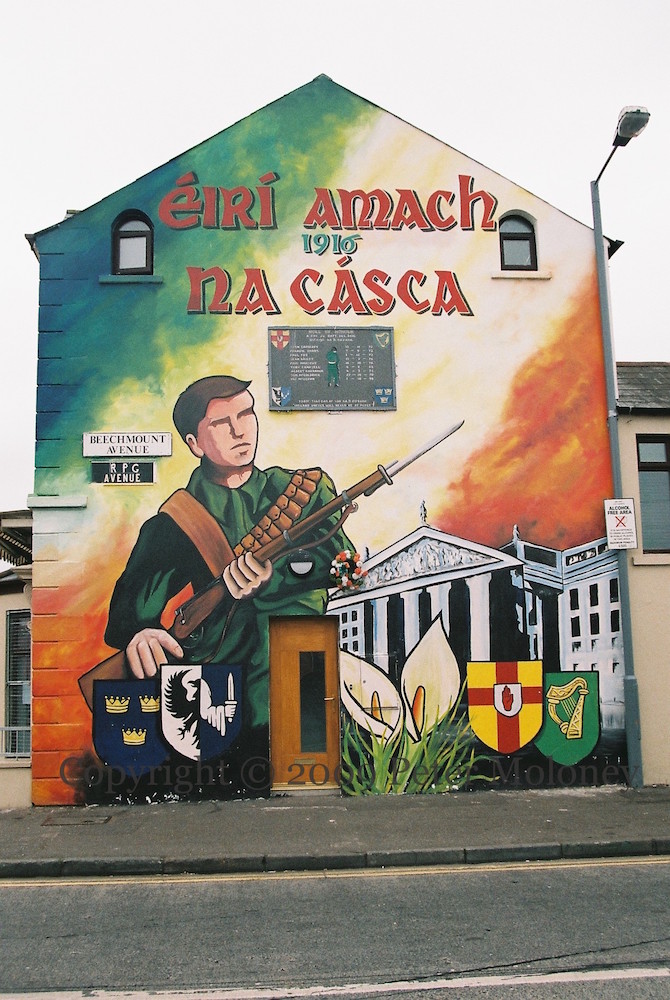 The Éırí Amach Na Cásca 1916 [Easter Rising 1916] mural in Beechmount Avenue/Ascaıll Ard Na bhFeá/RPG Avenue is repainted (by DD and Seany McVeigh) due to the new doorway. Compare to the previous version. (See also the IRA plaque.)