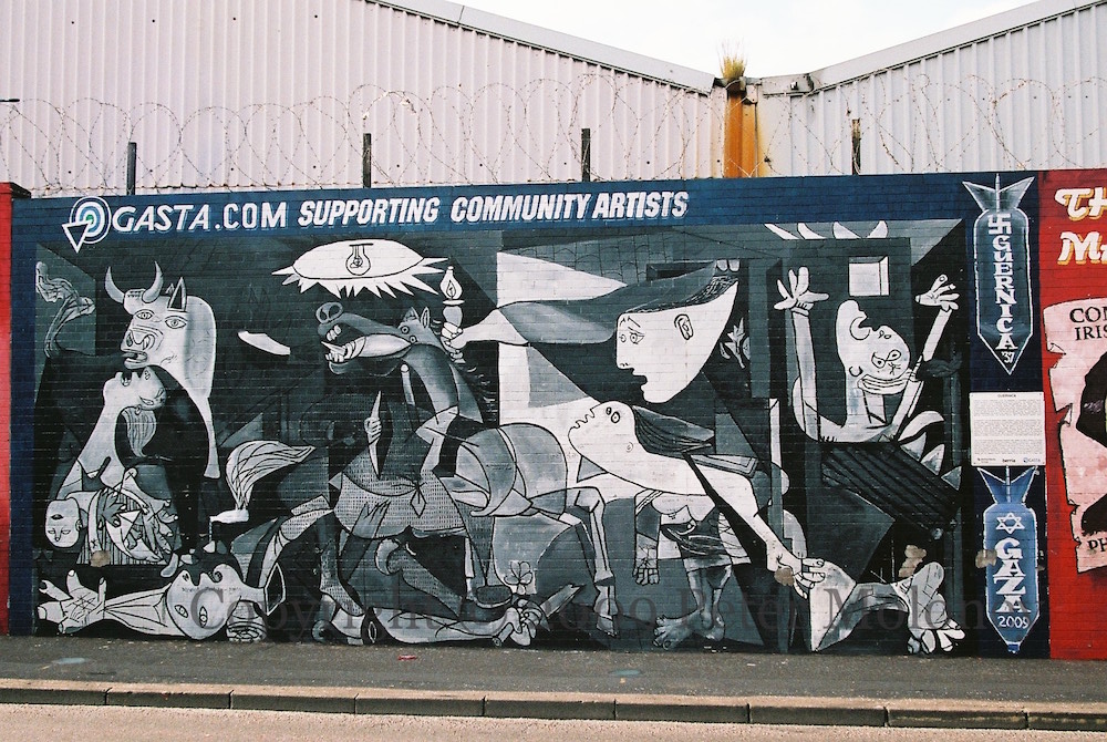 2009 image of the Guernica mural on the so-called ‘International Wall’, update with a pair of falling bombs on the right. Above, a Nazi bomb falls on Guernica in 1937; below, an Israeli bomb falls on Gaza in 2009.
