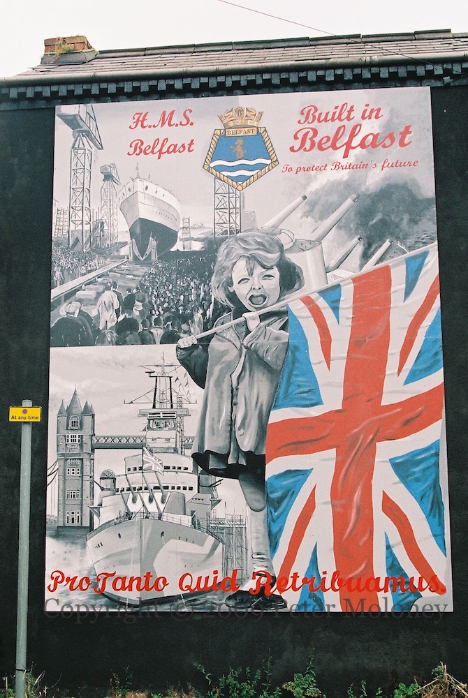“HMS Belfast – built in Belfast to protect Britain’s future. Pro tanto quid retribuamus. [What shall we give in return for so much? – the motto of Belfast city]”. The mural shows HMS Belfast being launched on March 17, 1938. Tower Street, Belfast. After serving in WWI and Korea, the ship is now a tourist attraction in London.