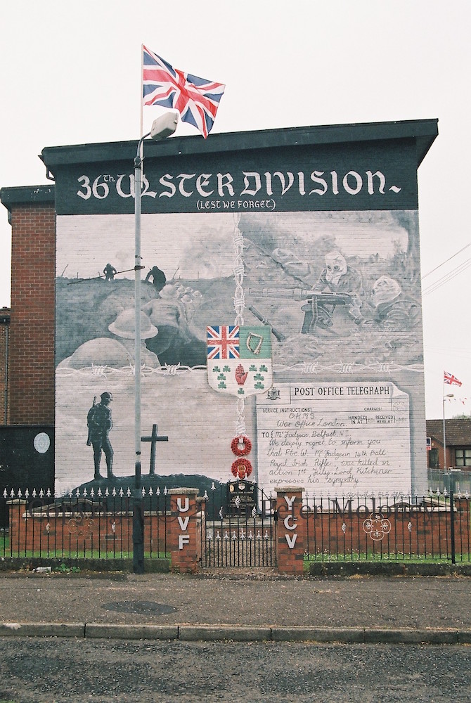 The plaques read “36th Ulster Division – dedicated to all our fallen comrades who made the ultimate sacrifice for their country. Greater love hath no man than to lay down his life for his friends. For God and Ulster.” and “From the officers and volunteers of East Belfast to commemorate the 90th anniversary of the Great War.” The quadrants of the mural show (clockwise) soldiers in the trenches, soldiers manning a machine-gun, the death telegraph for William MacFadzean, and a soldier reflecting on a grave. UVF YCV “Lest we forget”