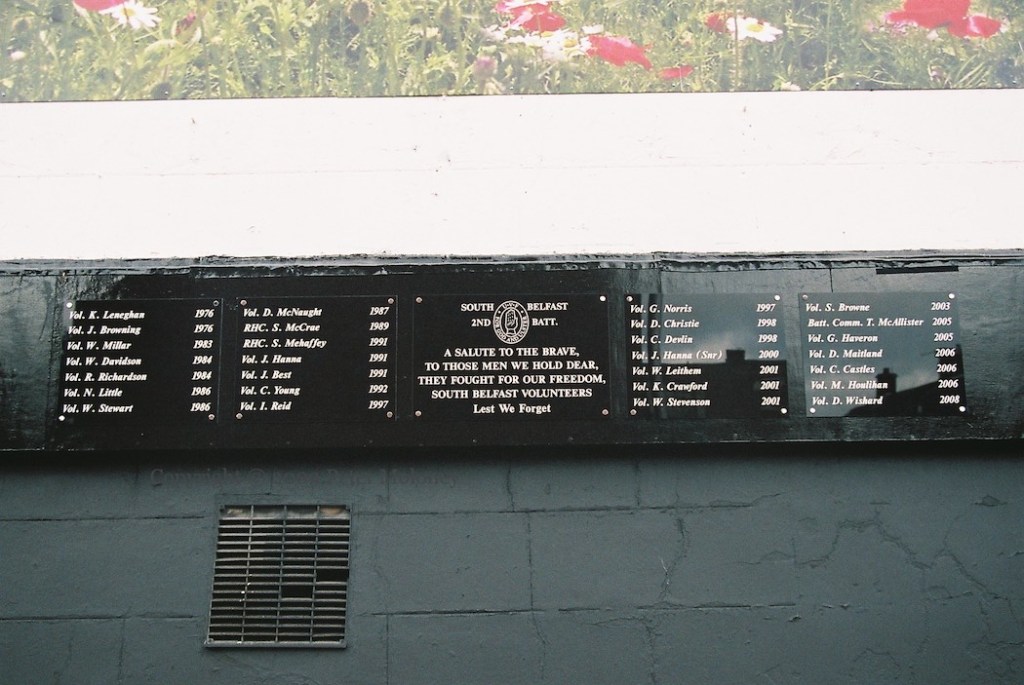 “Lay them away on the hill side/along with the brave and the bold/Inscribe their names on the role [sic] of fame/in letters of purest gold.” The Ulster Tower at Thiepval commemorates the WWI dead of the 36th (Ulster) Division. The words, however, come from a song about James Daly, who was executed by firing squad for taking part in a 1920 mutiny of the Connaught Rangers in India in protest of the activities of the Black and Tans. Above is the insignia of “UVF South Belfast 2nd battalion” and below is a roll of honour for the battalion: “A salute to the brave/to those men we hold dear/they fought for our freedom/south Belfast volunteers.” Compare this mural to the previous (Here Lies A Soldier), which does not include any reference to the Great War.