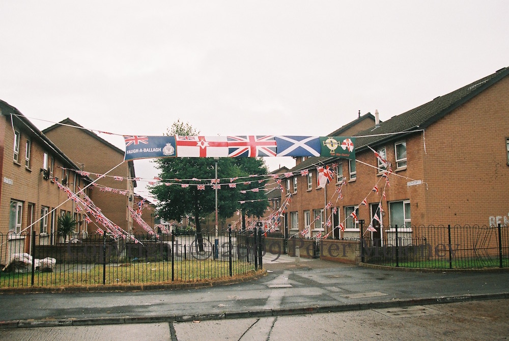 This is the Twelfth scene in Edith Street, off Lord Street. The flags across the front are Faugh-a-ballagh (Royal Irish Regiment), Ulster Banner (with Union Flag), Union Flag, St Andrew’s Saltire, and Irish Football Association.