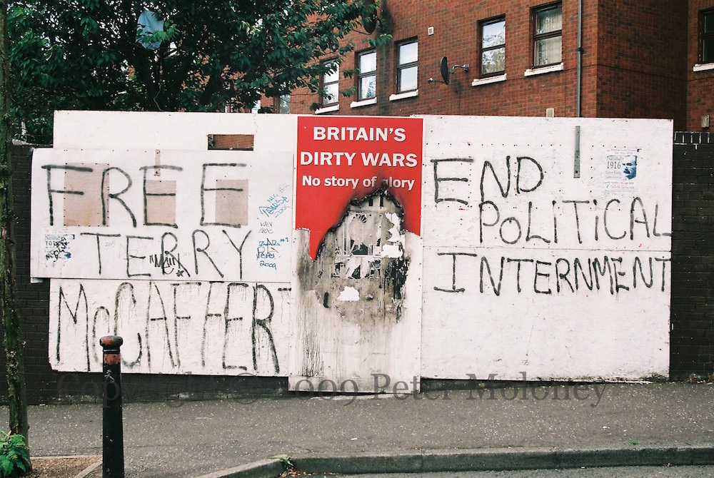 The New Lodge’s Terry McCafferty (RIRA) was given 12 years for possession of explosives in 2005. He was released briefly on license in late 2008 before being returned to Maghaberry – the reason for the revocation was not disclosed (until December 2009) leading to claims of internment. He would be released in April 2010 (RN). The board in the middle “Britain’s dirty wars – no story of glory” is otherwise unknown.