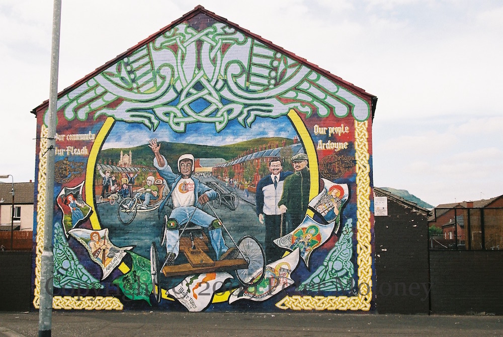 “Our community, our fleadh, our people – Ardoyne”. The Ardoyne fleadh cheoıl (tw | Fb) is held each August and includes fun days for the kids in addition to concerts. The plaque on the right indicates that the mural was part of the 2009 Re-Imaging Programme. The wall (on Brompton Park) has historically had a Fleadh mural (Maıreann An Spıorad | Fleadh Érıu – included on the 1995 poster, under the go-kart’s left wheel) though the immediately prior mural was a 25th anniversary hunger strike mural.