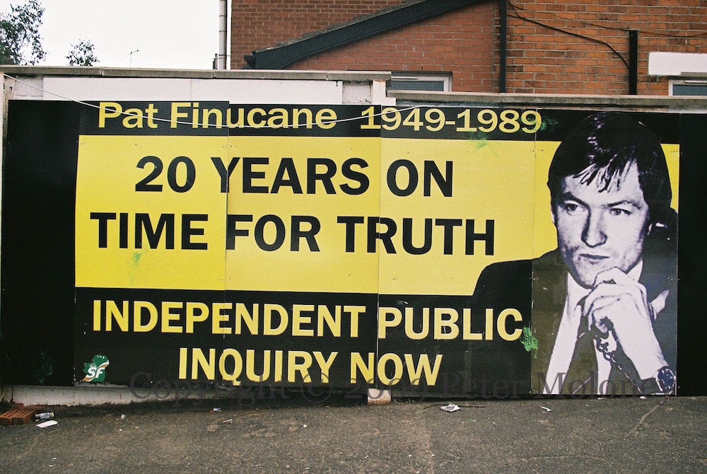 “20 years on – time for the truth. Independent public inquiry now.” Solicitor Patrick Finucane was killed in front of his family by UDA member Ken Barrett in 1989. The UK government would admit collusion between the RUC and UDA concerning the case in 2011 but fail to order a public inquiry.