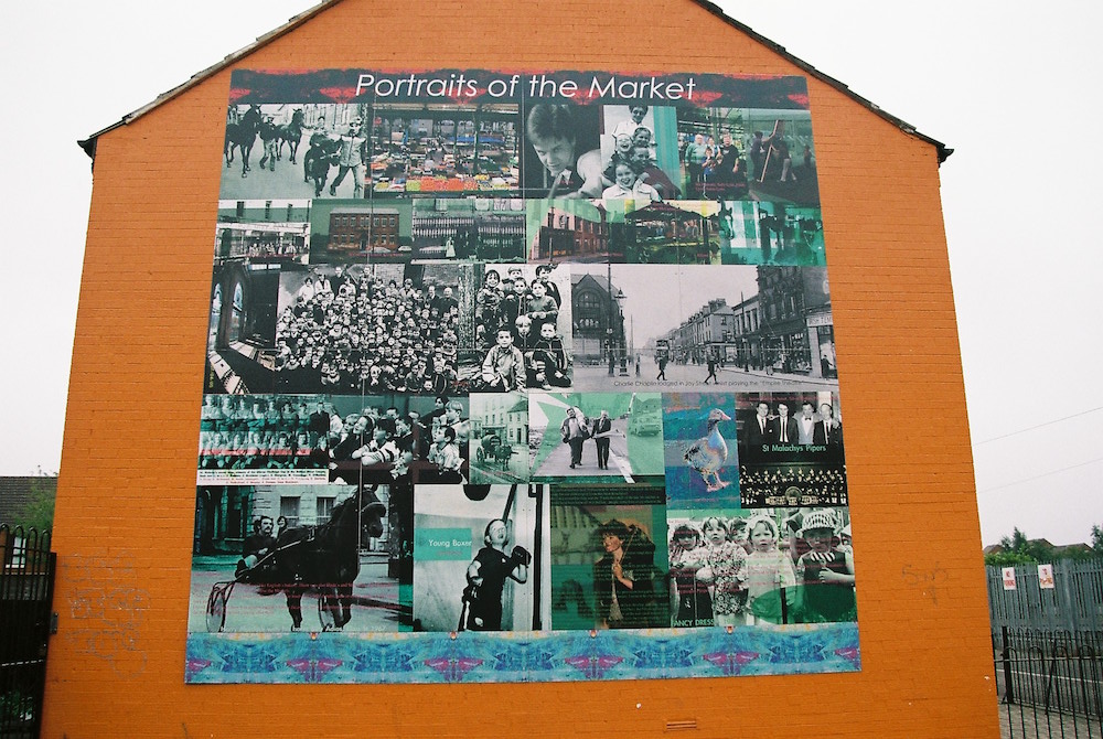 Artist Raymond Henshaw undertook a series of six collages of photographs of the Markets area of south Belfast (in 2008): Social, Bars, Industry, Social History, Sport & Culture, and – shown in today’s post – Portraits of locals, such as snooker player “Joe Swales” (Joe Swail) and familiar buildings, such as Loughran’s Shop. The boards were part of the 2008 re-imaging campaign and sponsored by the Arts Council.