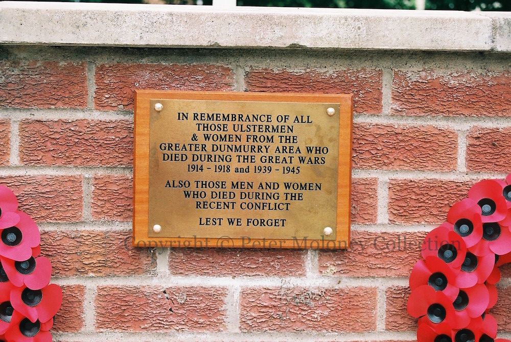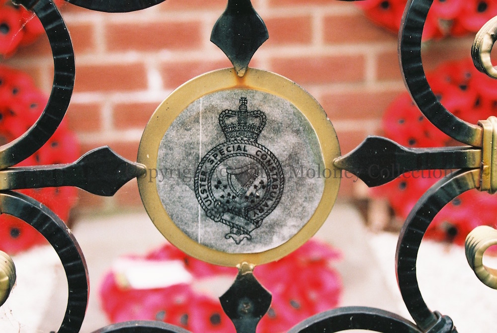 “In remembrance of all those Ulstermen & women from the Greater Dunmurry area who died during the great wars 1914-1918 and 1939-1945. Also those men and women who died during the recent conflict. Lest we forget.” The “recent conflict” perhaps includes the Ulster Special Constabulary (the B Specials), formed in 1920 and replaced by the UDR in 1970 – as included in the plaque on the railings. Rowan Drive, Dunmurry. See previously: Their Loyalty Betrayed and the 2005 images of Freedom Corner.
