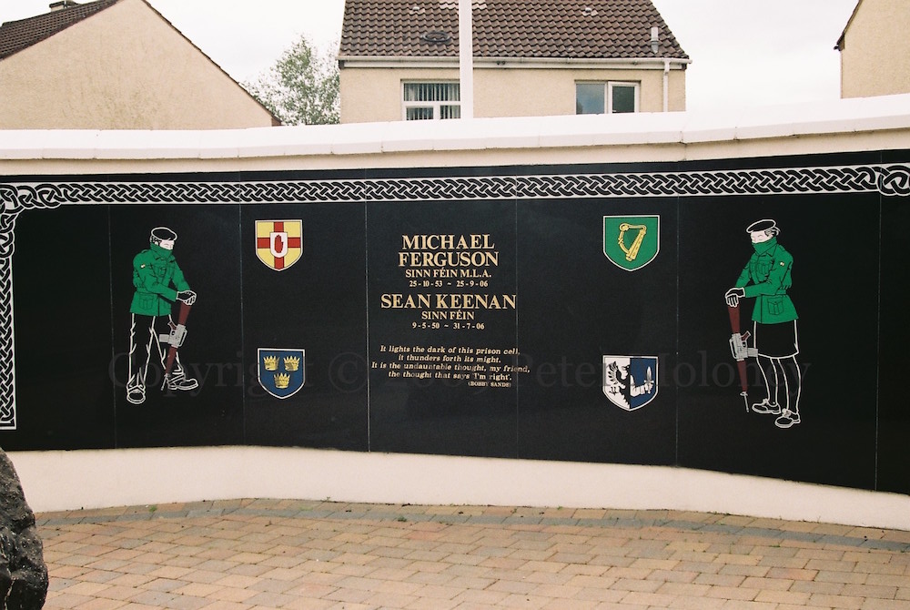 “Michael Ferguson Sınn Féın MLA 25-10-53–25-9-06. Sean Keenan Sınn Féın 9-5-50–31-7-06. “It lights the dark of this prison cell/it thunders forth its might/it is the undauntable thought, my friend/the thought that says ‘I’m right'” – Bobby Sands”. Keenan was son of Derry republican Seán Keenan.