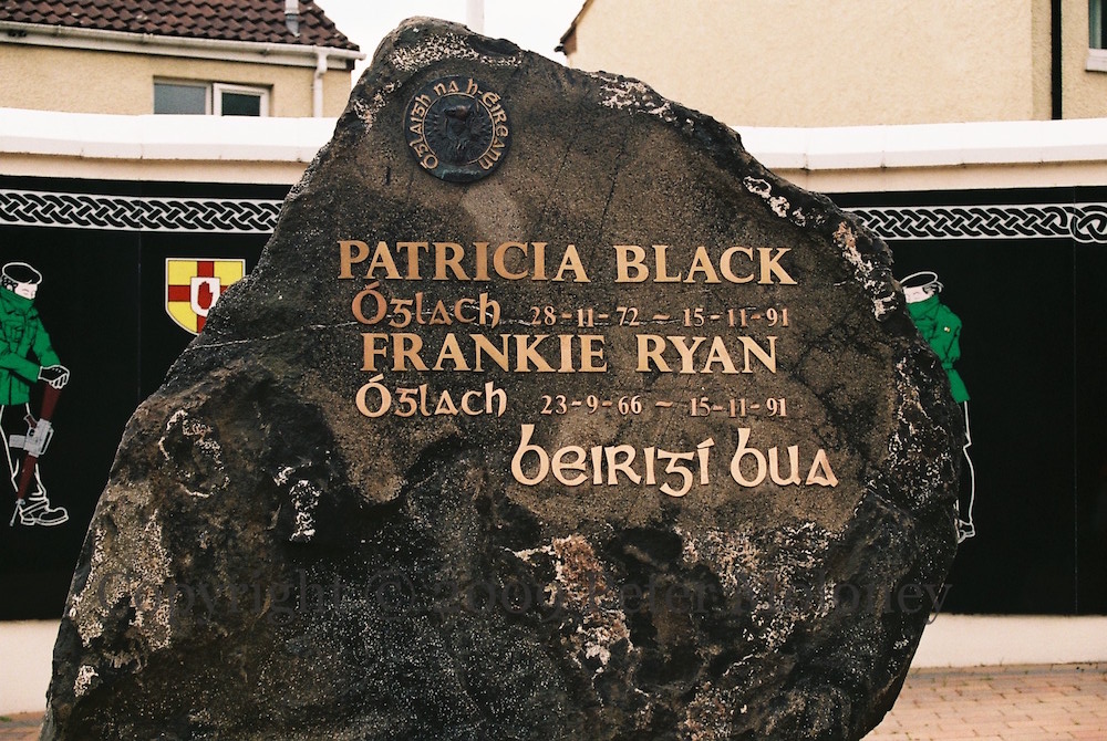 “Óglaıgh Na hÉıreann. Óglach Patricia Black 28-11-71–15-11-91. Óglach Frankie Ryan 23-9-66–15-11-91. Beırıgí bua.” The pair died near London when a bomb exploded prematurely.
