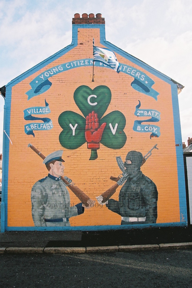 2009 images of the YCV mural on Broadway in the Village, Belfast, seen previously in 2008. The plaque on the side wall reads: “In loving memory of Volunteer Colin Castle, died 17th February 2006. Lest we forget.” The additional wide shot includes the John Hanna mural and (barely visible) the small Gary Hamilton mural (see C05190).