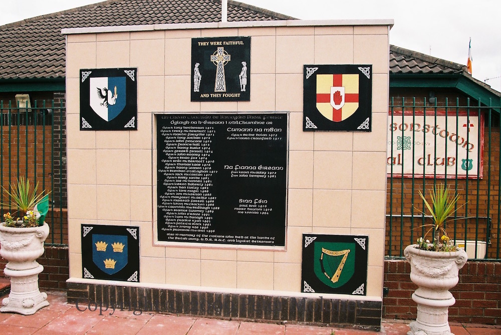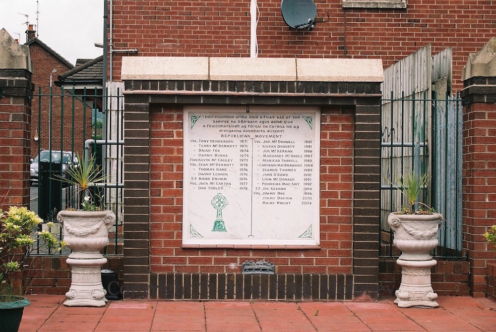 The main plaque (shown first above) is new; like its predecessor (see M02186) list of the local dead of the IRA 1st battalion, Belfast brigade and related members of the republican movement. (A shorter list is on the plaque to the left, shown second.) There is also a 200th anniversary plaque for the 1798 rebellion: “1798-1998 Who Fears To Speak Of 98. This plaque was erected to the memory of the United Irishmen who gave their lives for Irish freedom also those who died as a result of the Great Hunger. ‘These are the times that try mens’ souls.’ [- Thomas Paine] The rich always betray the poor.’ – Henry Joy McCracken.” The memorial garden is next to the Andersonstown Social Club (a.k.a. the PD or “People’s Democracy”).