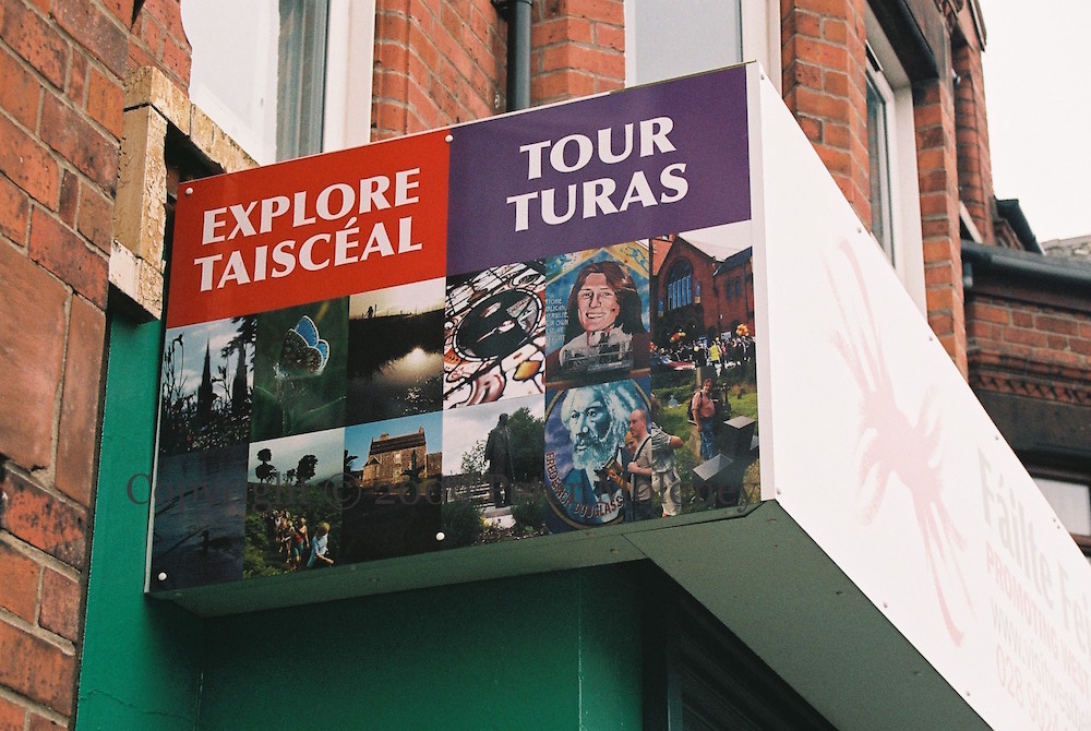 Murals are featured as part of an invitation to explore/taiscéal and take a tour/turas of west Belfast, on the office of Fáılte Feırste Thıar (in its second location: moved from 221 Falls Road to 243 Falls Road – and later again to 217 Falls Road). This BBC article describes a 1999 Fáılte map to help tourists get around.