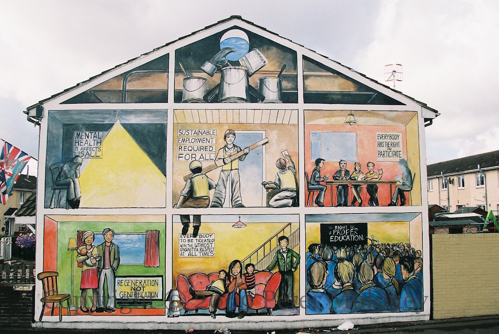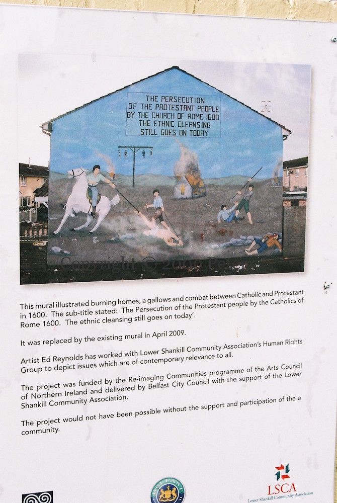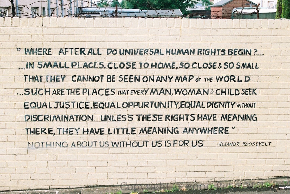 “Where after all do universal human rights begin? In small places, close to home, so close & so small that they cannot be seen on any map of the world. Such are the places that every man, woman & child seek equal justice, equal opportunity, equal dignity without discrimination. Unless these rights have meaning there, they have little meaning anywhere.” – Eleanor Roosevelt. “Nothing about us without us is for us.” Artist Ed Reynolds (steadyhanded.com) replaces the ‘Protestant Ethnic Cleansing‘ mural with one about human rights. With the Lower Shankill Community Association.