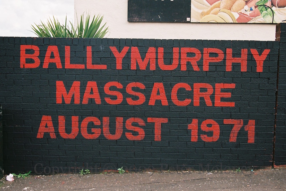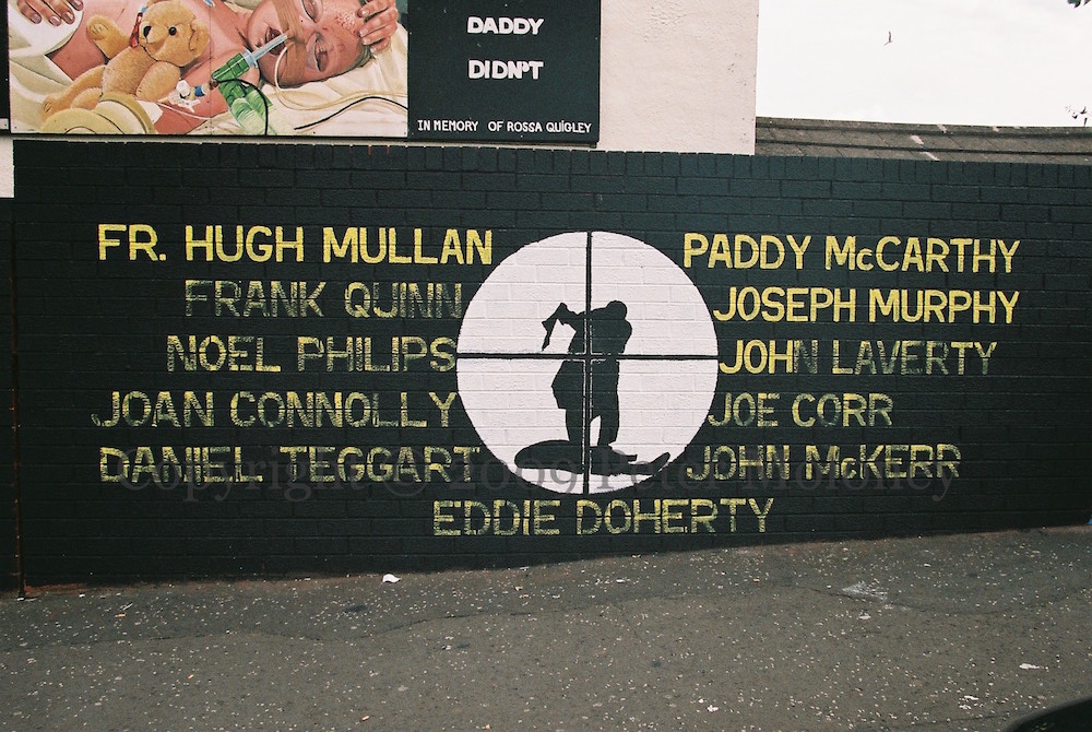 11 Catholic civilians from Ballymurphy were shot and killed by British Army paratroopers on August 9th-11th, during the initial wave of internment. Father Hugh Mullan, the second to be killed, is shown in the cross-hairs of a rifle’s sight, waving a baby’s onesie as he goes to the aid of a wounded man (Bobby Clarke). “Time for truth, time for justice. The families demand … an international independent investigation surrounding all of the deaths … the British government to issue a statement of innocence and a public apology.” “57 children left without a parent. Hundreds [of other children never got to meet their granny, granda, aunt or uncle.]” The blank panel is for “Family Messages”.