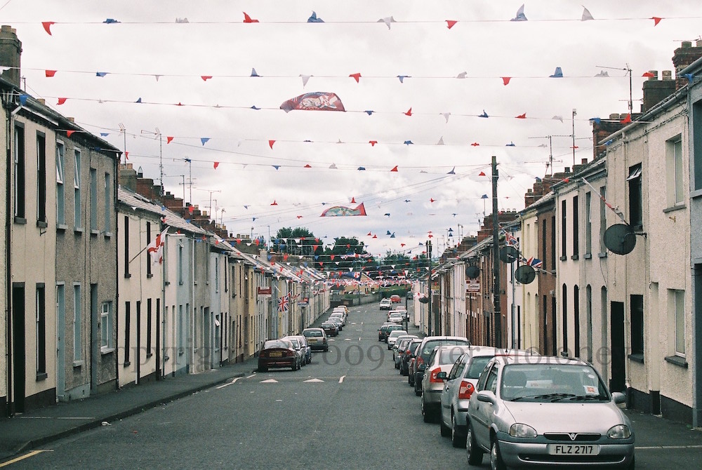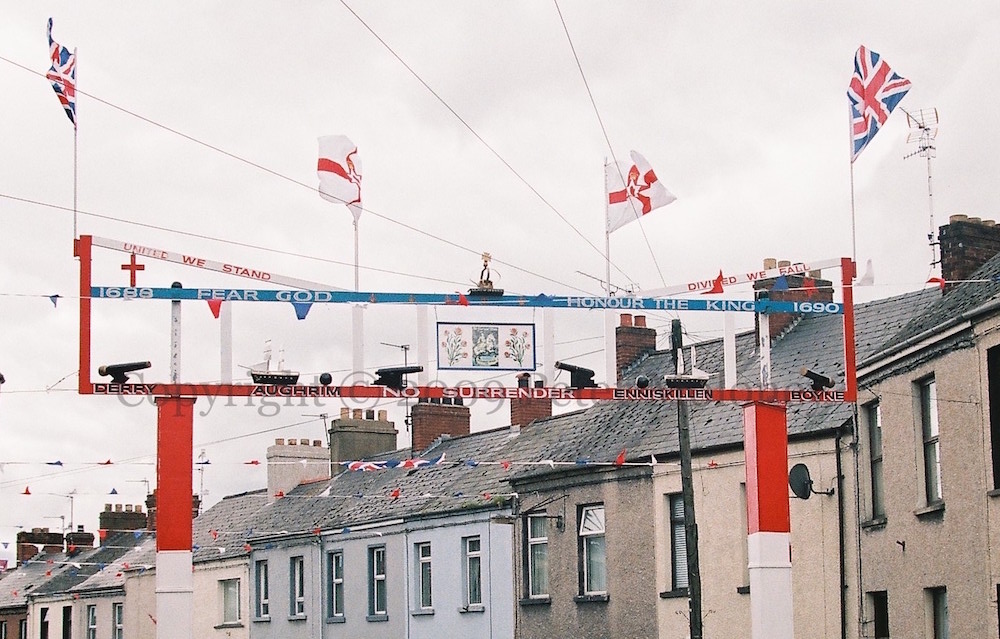 Orange Order symbols and slogans on the arch in Jervis Street, Portadown: “United we stand, divided we fall”, “Fear God, honour the king”, “The glorious memory – 1690” “For God and Ulster”. King Billy is shown between two panels of orange lilies.