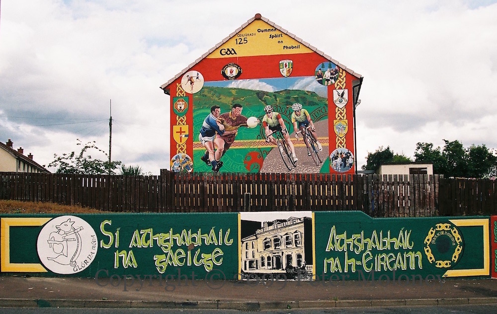 “Gabh Gaelach” [Go Gaelic]. “Is fearr Gaeılge bhrıste ná Béarla clıste” [Broken Irish is preferable to clever English]. “Tír gan teanga, tír gan anam” [A land without a language is a land without a soul]. “Sí athghabháıl na Gaeilge athghabháıl na hÉıreann” [The repossession of Irish is the repossession of Ireland] – based on a quote by Máırtín Ó Cadhaın. Bunscoıl An tSléıbhe Dhuıbh [Black Mountain Primary School]. The mural on the gable celebrates 125 of the GAA, particularly local teams Cumman [sic] Spóırt An Phobaıl, Cardinal O’Donnell’s, Gort Na Móna, and Cumann Naomh Eoın.