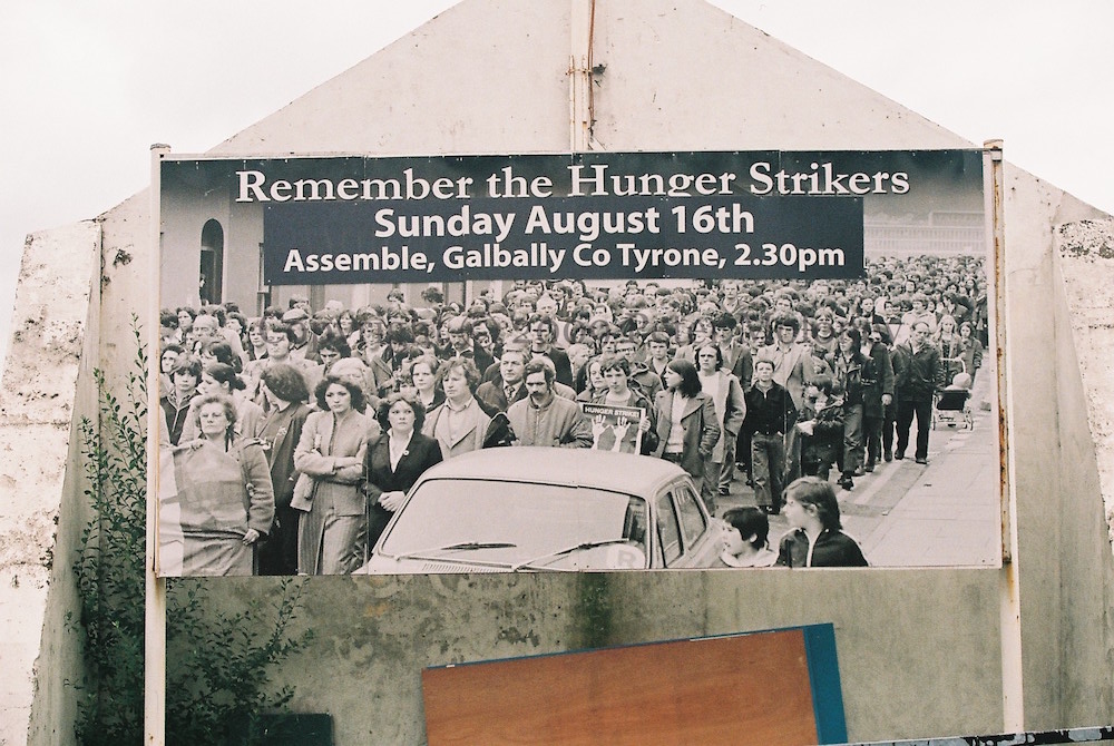 “Remember the hunger strikers. Sunday August 16th. Assemble, Galbally Co Tyrone, 2:30 pm”. The rear of Free Derry Corner has its own Visual History page. For other boards encouraging attendance see Galbally Commemoration.