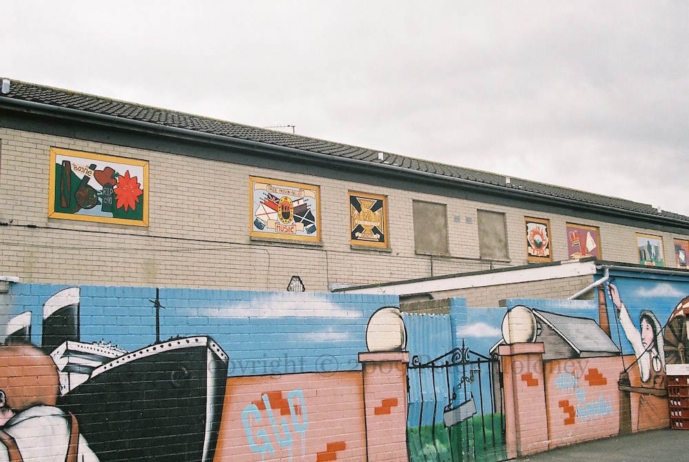 Here is the scene at Mourne Road along the side of the Mace (later a Spar). On the low wall is a ‘Mourneview Youth’ mural (presumably by BlazeFX) – there were previously LVF murals on this wall. In the bricked-up windows are a series of cultural panels, on the Battle Of The Boyne, music, William McFadzean’s VC, fire, faith, defence (WWI), plus one other (perhaps ‘school’?)