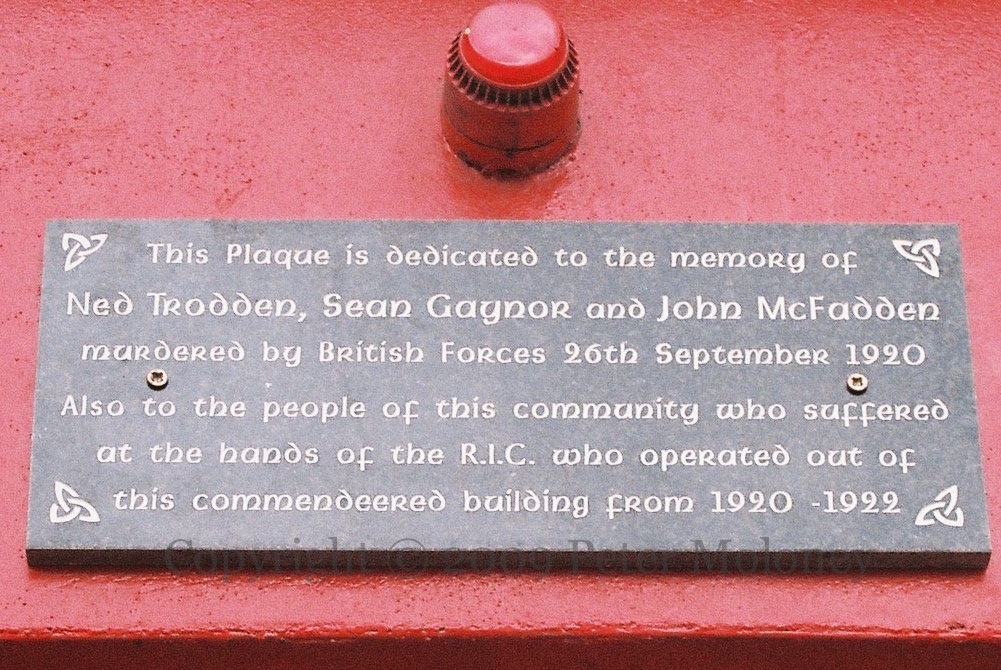 “This plaque is dedicated to the memory of Ned Trodden, Sean Gaynor and John McFadden murdered by British Forces 26th September 1920. Also to the people of this area who suffered at the hands of the RIC who operated out of this commendeered [sic] building [i.e. the Beehive Bar] from 1920-1922.” For more on the trio’s deaths, see The RIC Murder Gang (here called “British Forces”).
