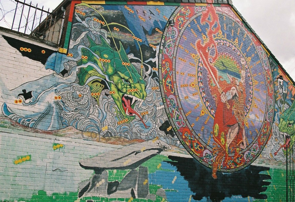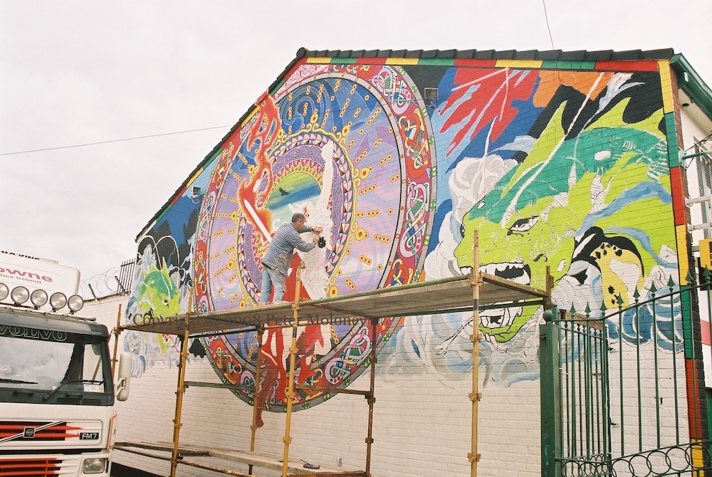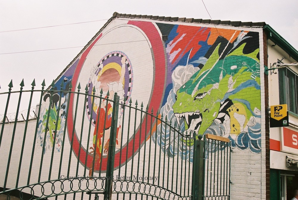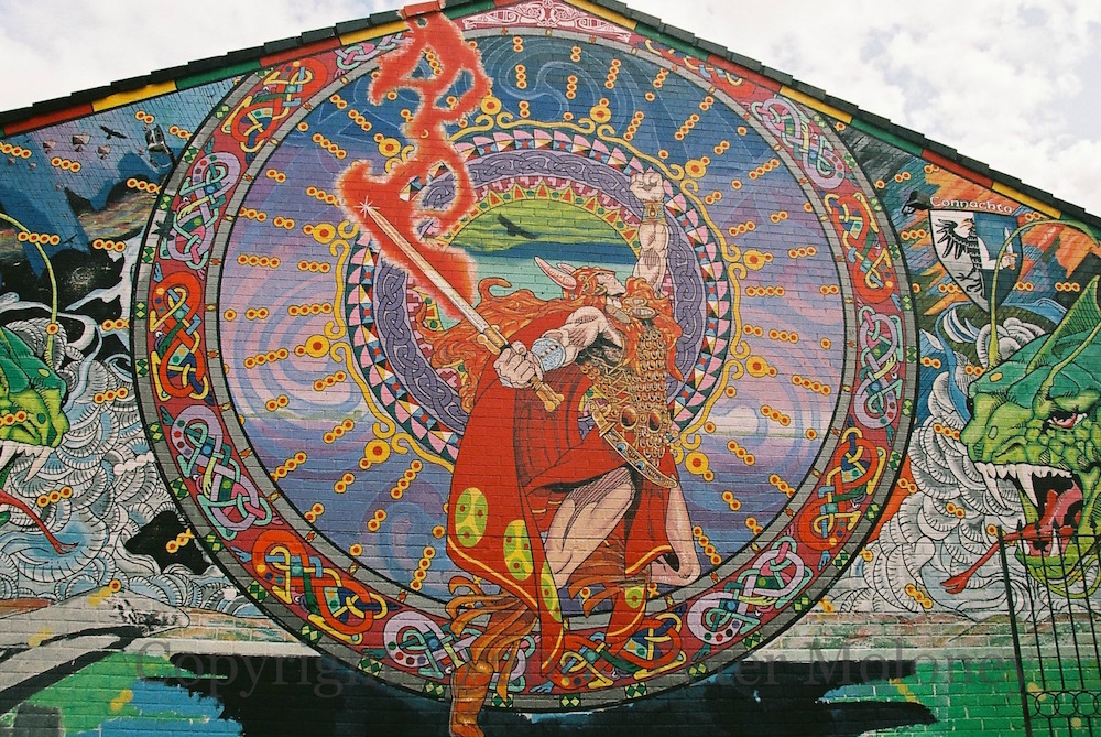 Gerard ‘Mo Chara’ Kelly first painted a mural of King Nuada in 1987, a year after being released from Long Kesh. He reproduced an illustration by Jim Fitzpatrick on a gable wall in Springhill (see images from 1987 | 1988 | 1989). This post-peace version is on the side-wall of the Whiterock Road Spar and was painted as statement of Kelly’s own rebirth after ceasing to work with funding agencies such as the Upper Springfield Development Trust. The third and fourth images are from 2008 and show the mural in an early state; the mural as shown above in 2009 is in fact still not complete – the bottom and left-hand side are unfinished. See these 2010 images for the full effect.