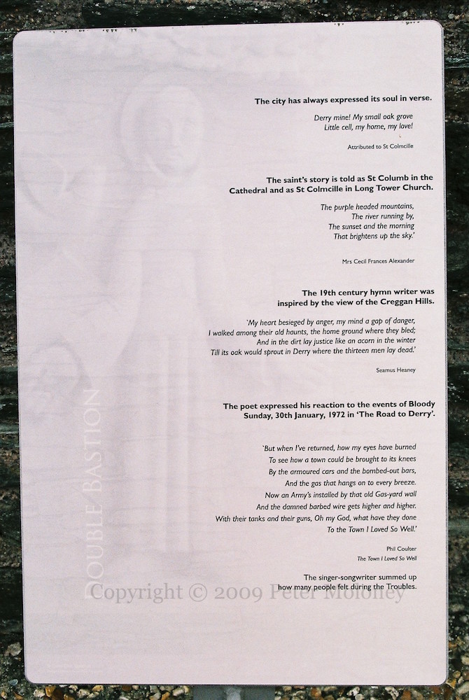 “This has always expressed its soul in verse. ‘Derry mine! My small oak grove/Little cell, my home, my love!’ – Attributed to St Colmcille. The saint’s story is told as St Columb in the Cathedral and as St Colmcille in the Long Tower Church.