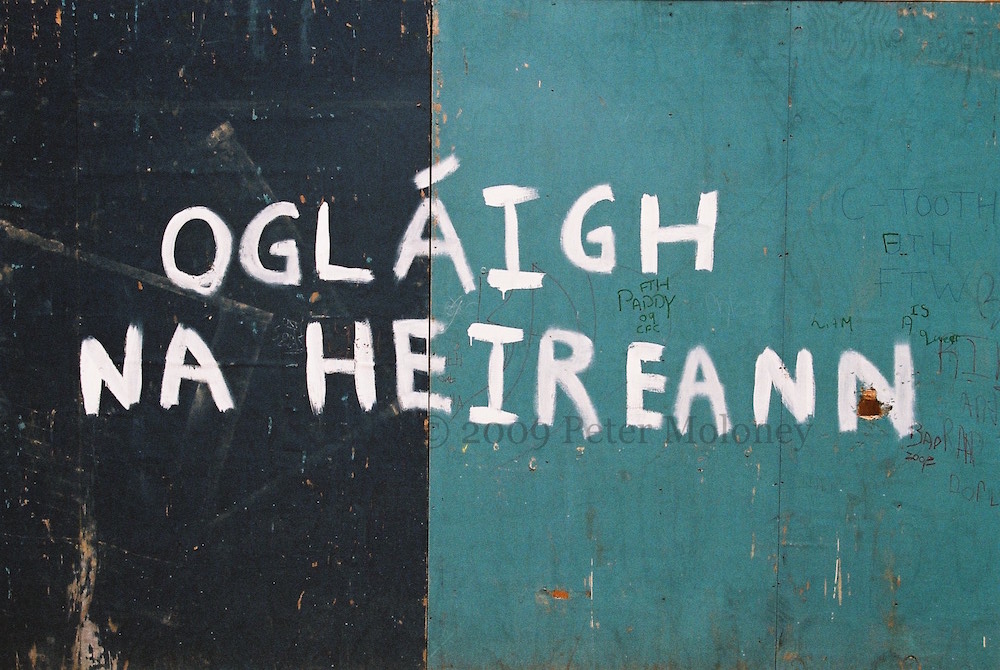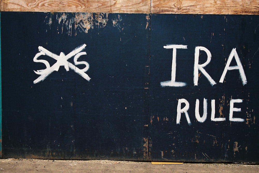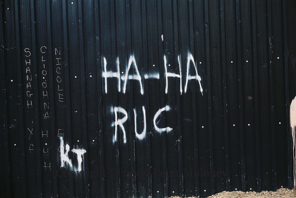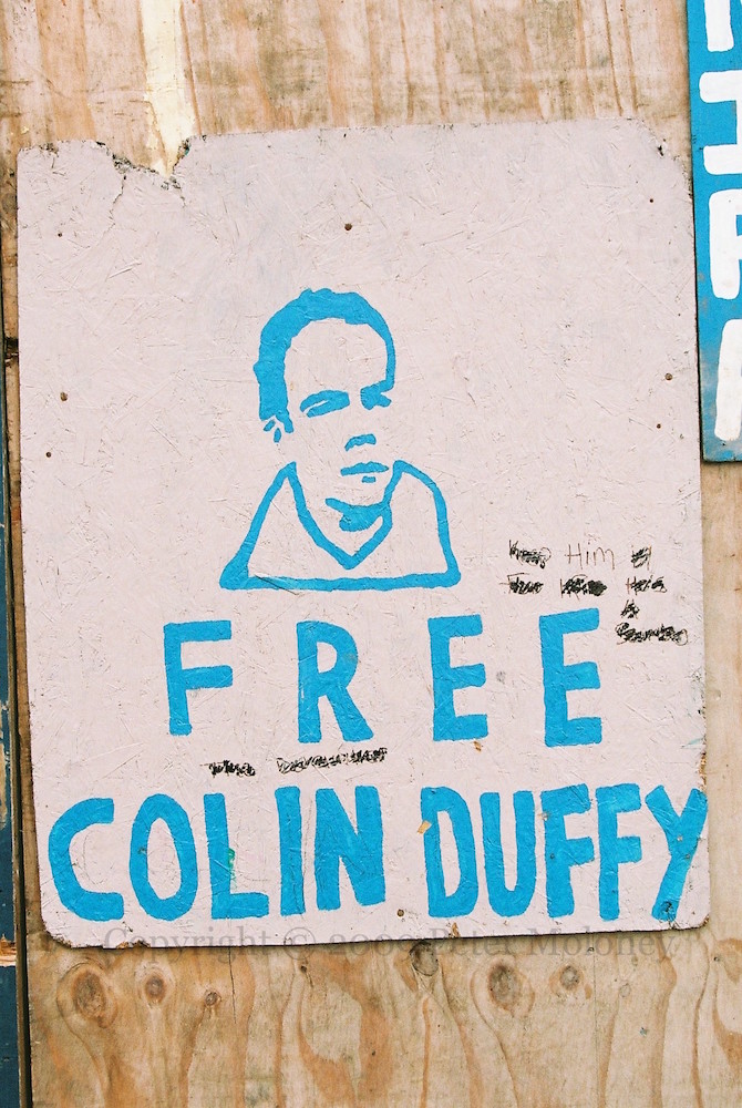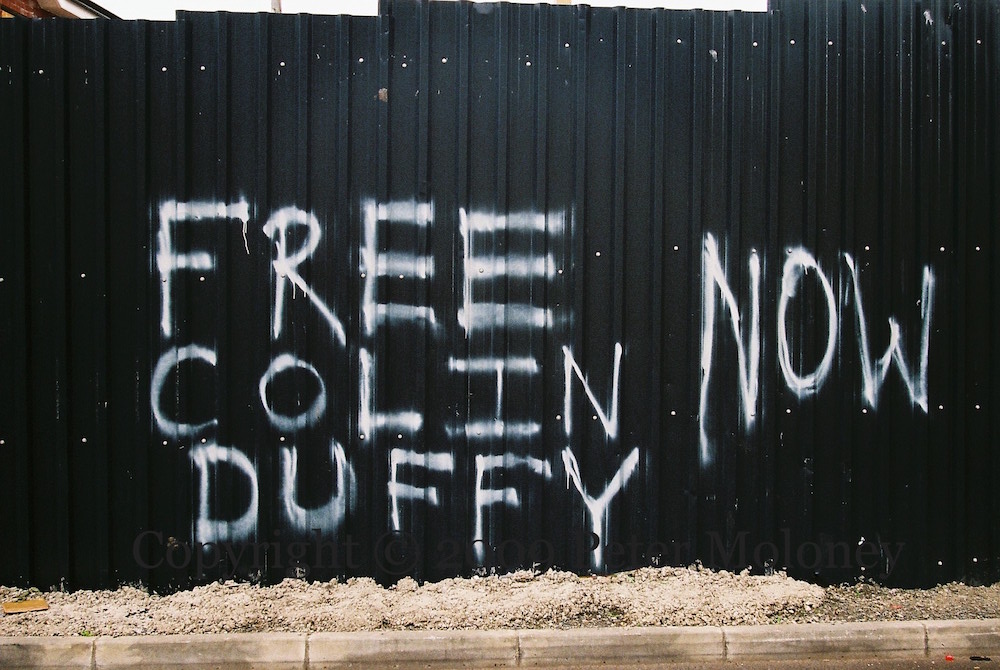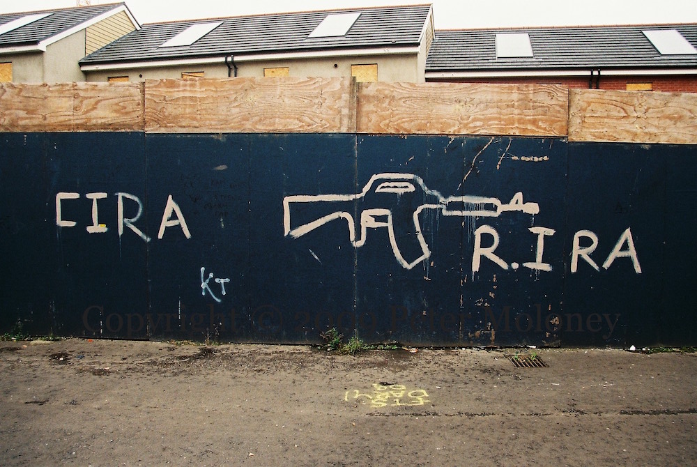 These graffiti and small boards are on the fence around Dove Gardens as it is rebuilt. “God bless the Loughgall martyrs” and “Óglaıgh Na hÉıreann” and “IRA rule” aim to establish the CIRA and RIRA as simply the IRA. For “Free Colin Duffy” see Freedom Is A State Of Mind.
