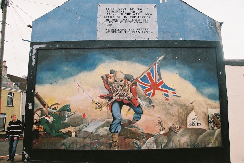 Iron Maiden’s ‘Eddie The Head’, here in the guise of a British Redcoat, strides over a Londonderry both old (vintage soldier on the left) and new (Free Derry Corner and The Petrol Bomber on the right). Compared to the previous version, the turned-over corners have been painted out and the skyline lowered. For more see Eddie’s Visual History page.
